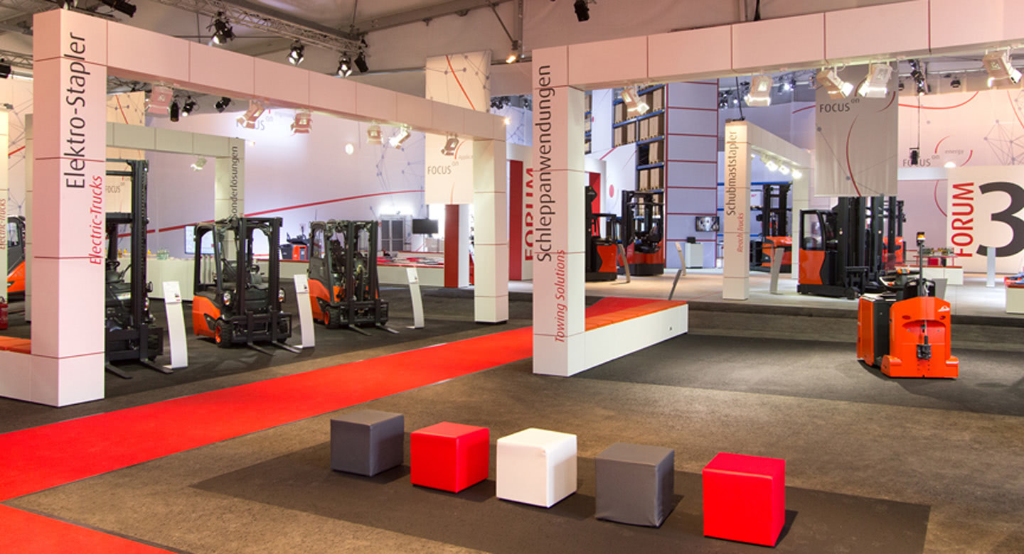 At Messepark Mainz, Linde Material Handling GmbH created an entire brand world out of nowhere. For three weeks, an area of 20.000 square meters turned into the “World of Material Handling”. Finearts from Munich commissioned us with the technical realization, i.e. sound, lighting, rigging and stage engineering. Their concept included a mixture of trade fair, event arena and conference. And we did our best to turn the briefing into reality.